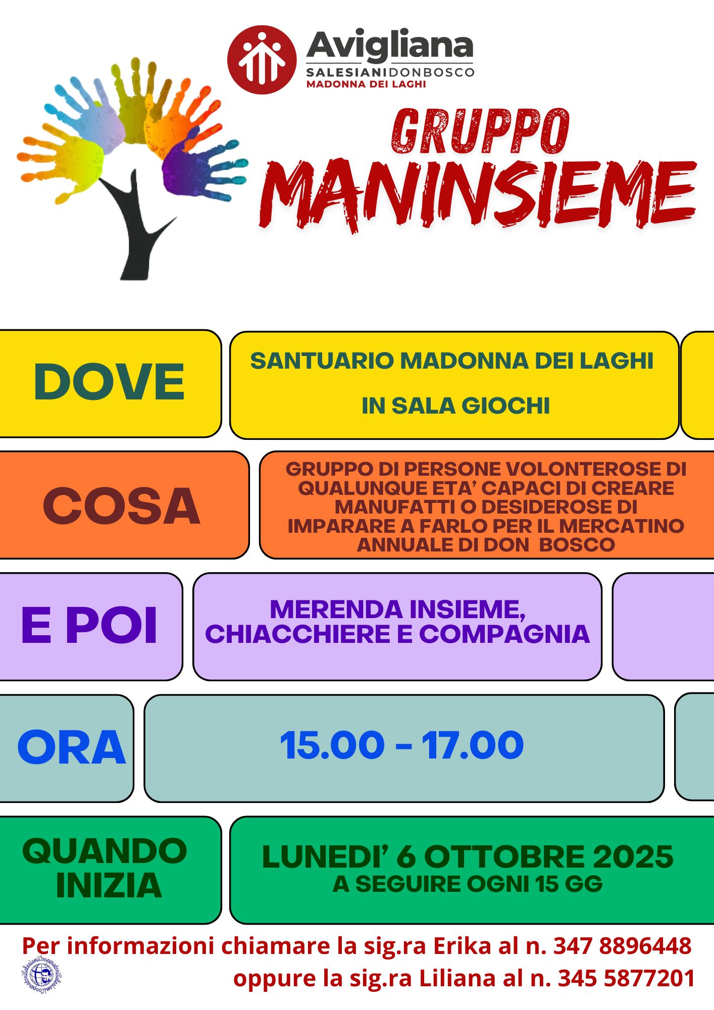 Il Santuario Madonna dei Laghi di Avigliana si prepara ad accogliere in Sala Giochi il gruppo “Maninsieme“: un gruppo di persone volenterose di qualunque età capaci di creare manufatti o desiderose di imparare a farlo per il mercatino annuale di don Bosco.